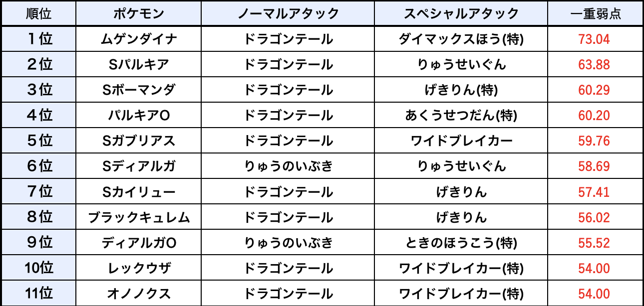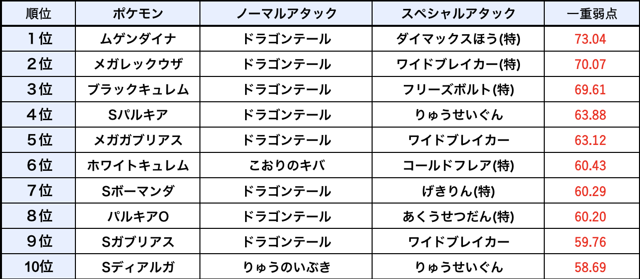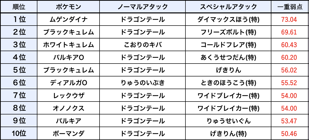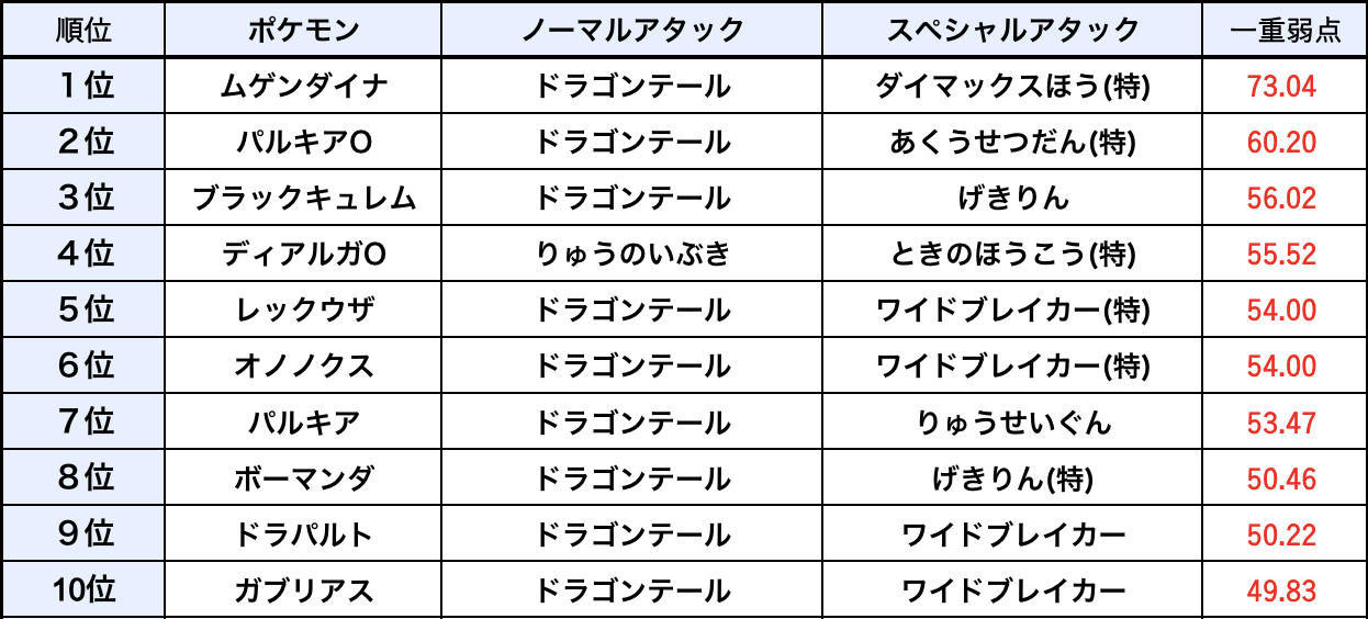ランキングはドラゴンわざで揃えたポケモン順位です。合体キュレムは特別わざの構成だと敵のタイプにより火力が変動する為「対ドラゴン単タイプ用順位」を別で記載します。