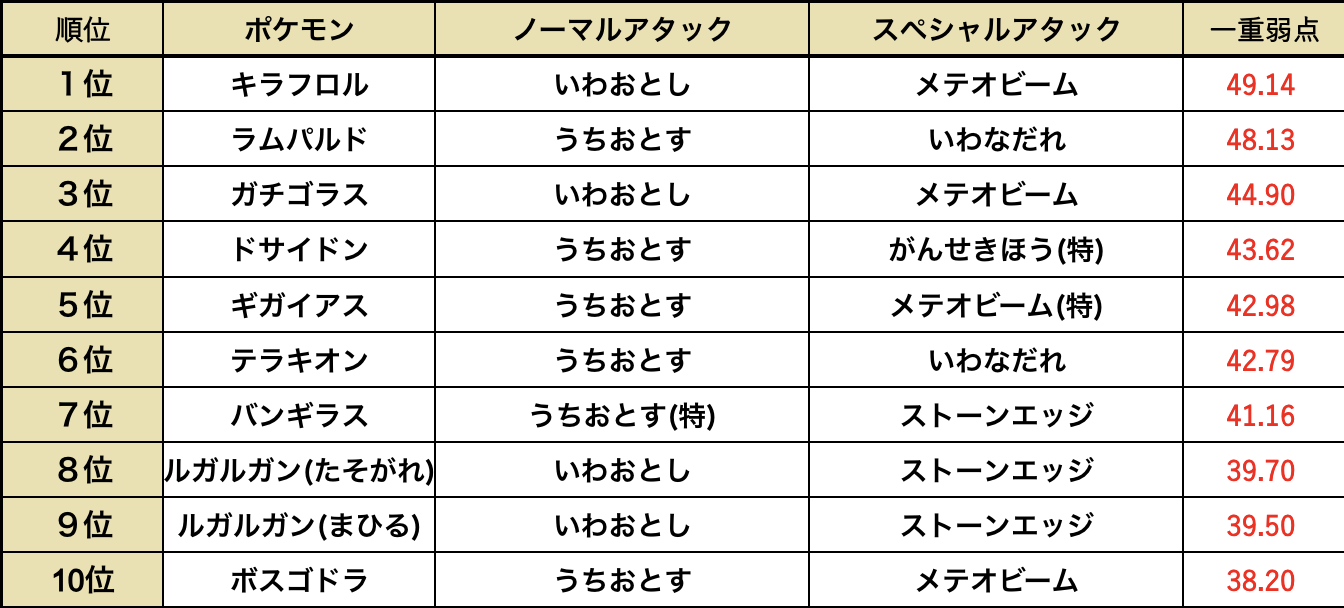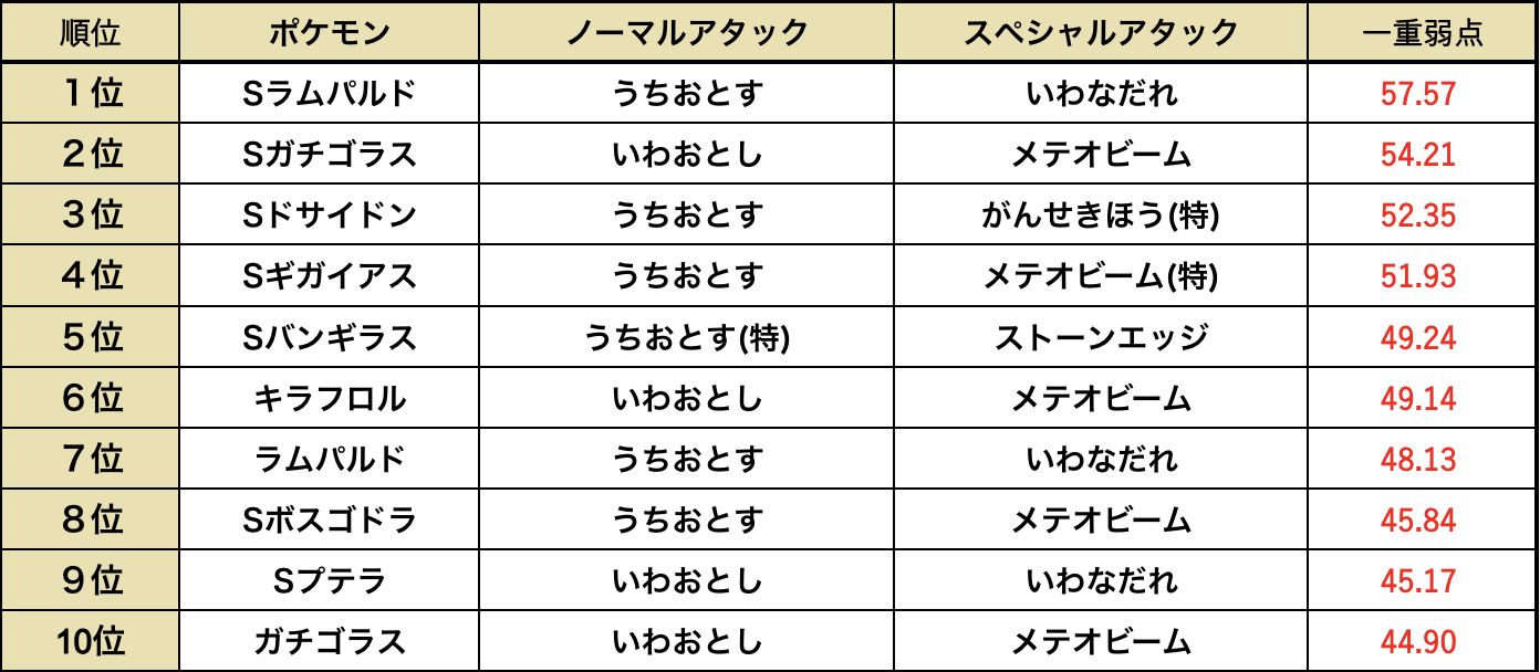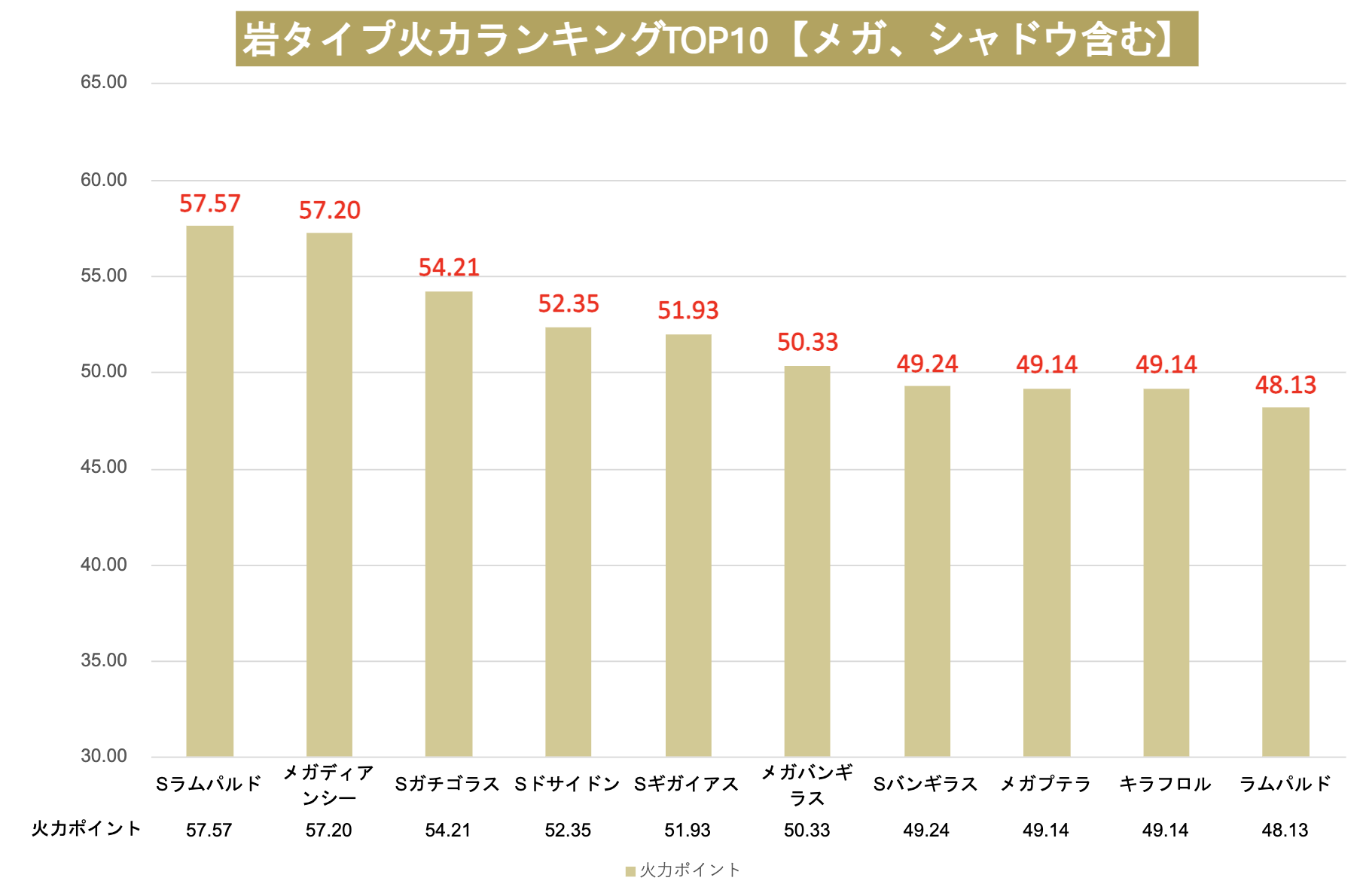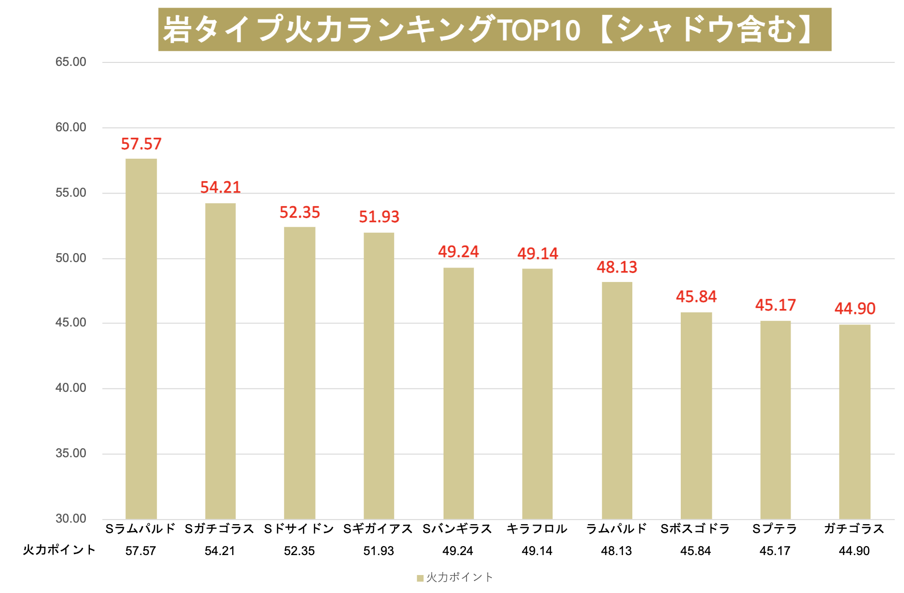 ※ノーマル&スペシャルアタック両方で岩タイプわざを持つポケモンを反映※耐久力が著しく低いポケモンは全岩タイプのランキングのみ含める※火力ポイントはDPS(ダメージ効率)のことで火力の指標
