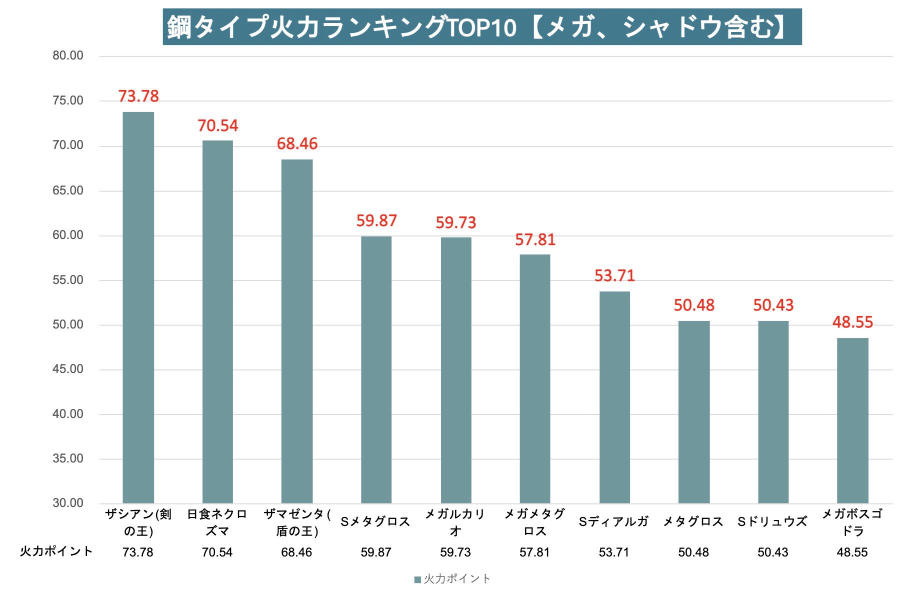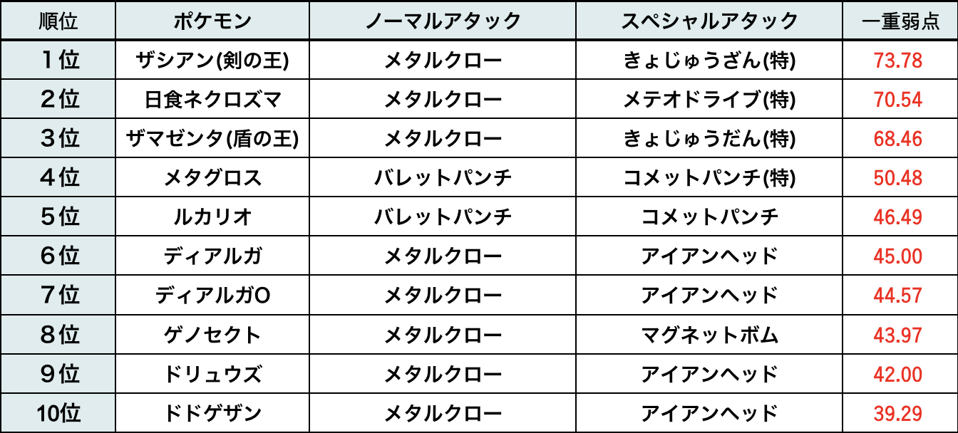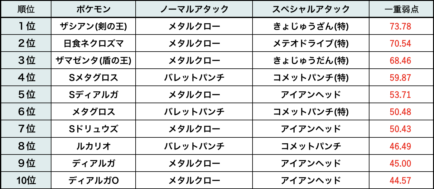 ※ノーマル&スペシャルアタック両方で鋼タイプわざを持つポケモンを反映※耐久力が著しく低いポケモンは全鋼タイプのランキングのみ含める※火力ポイントはDPS(ダメージ効率)のことで火力の指標