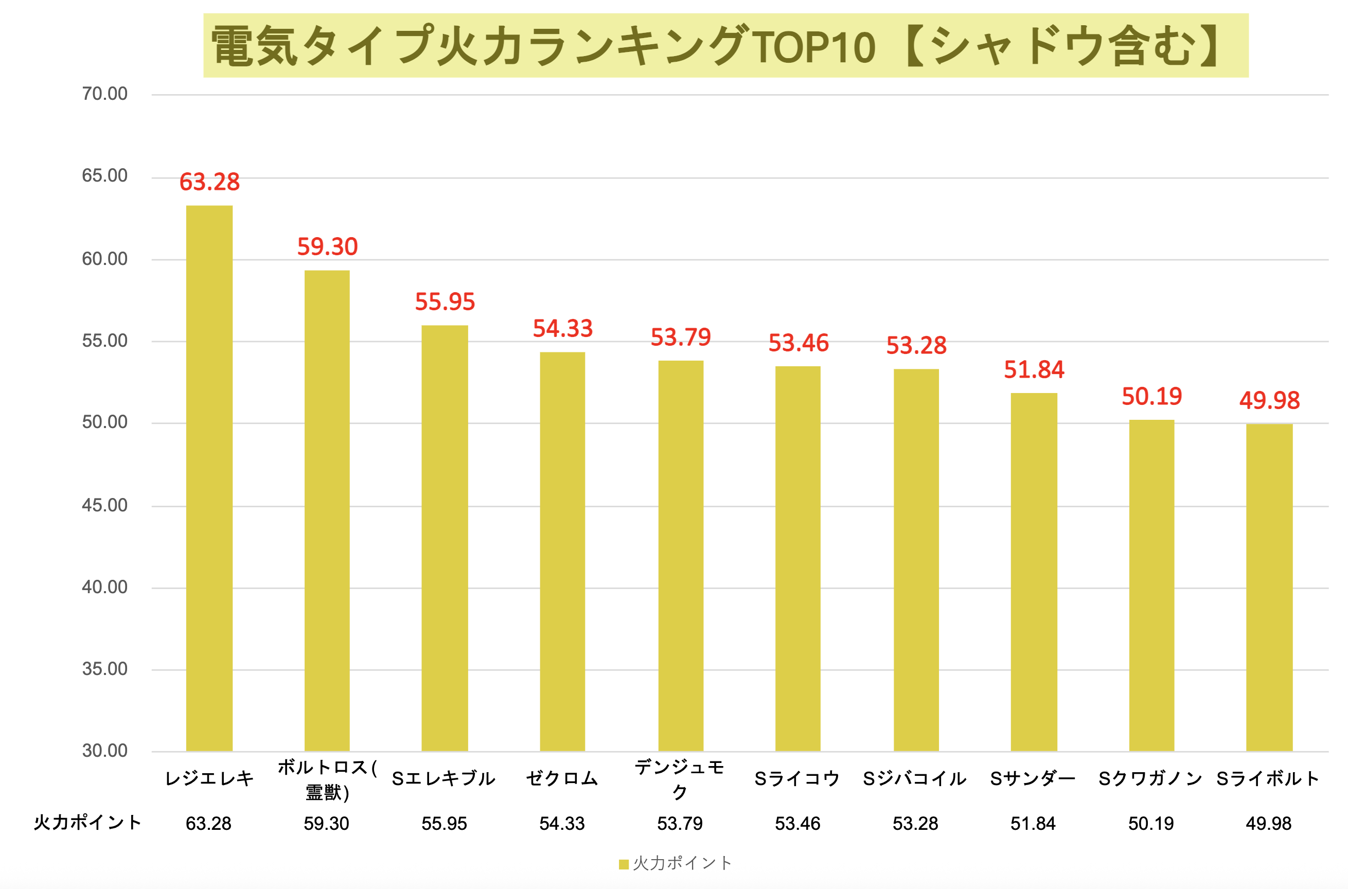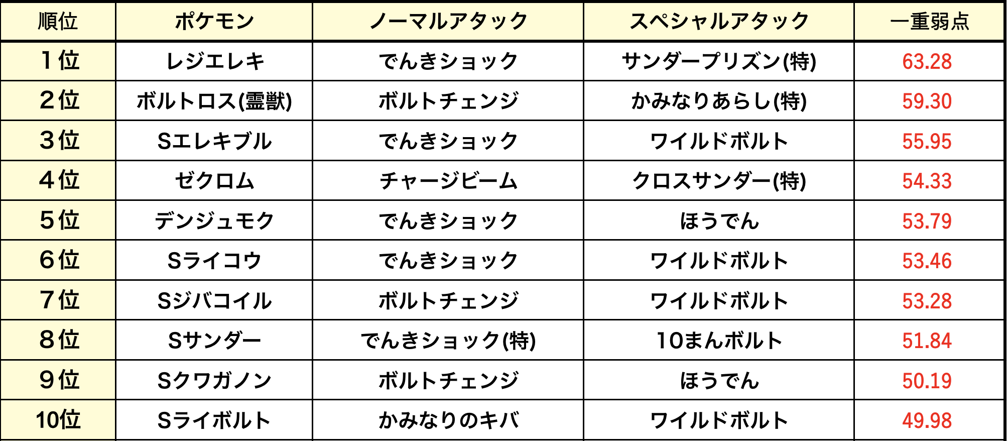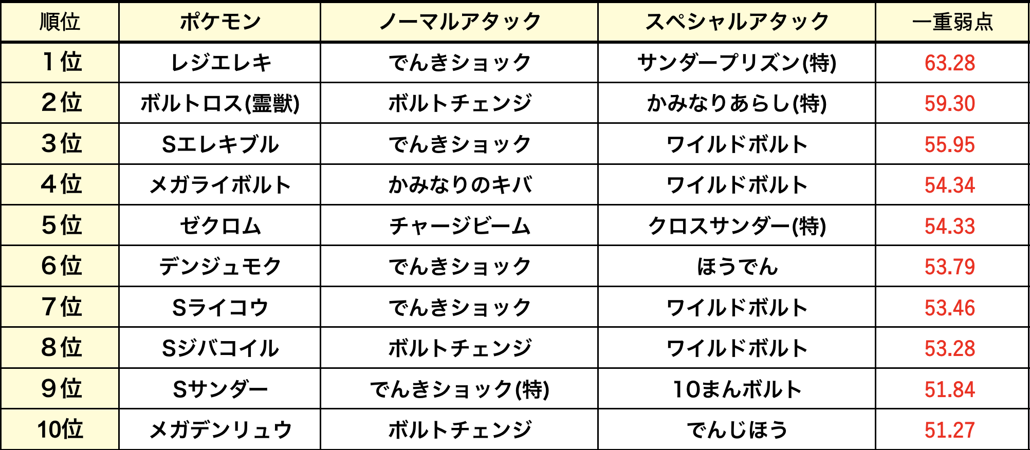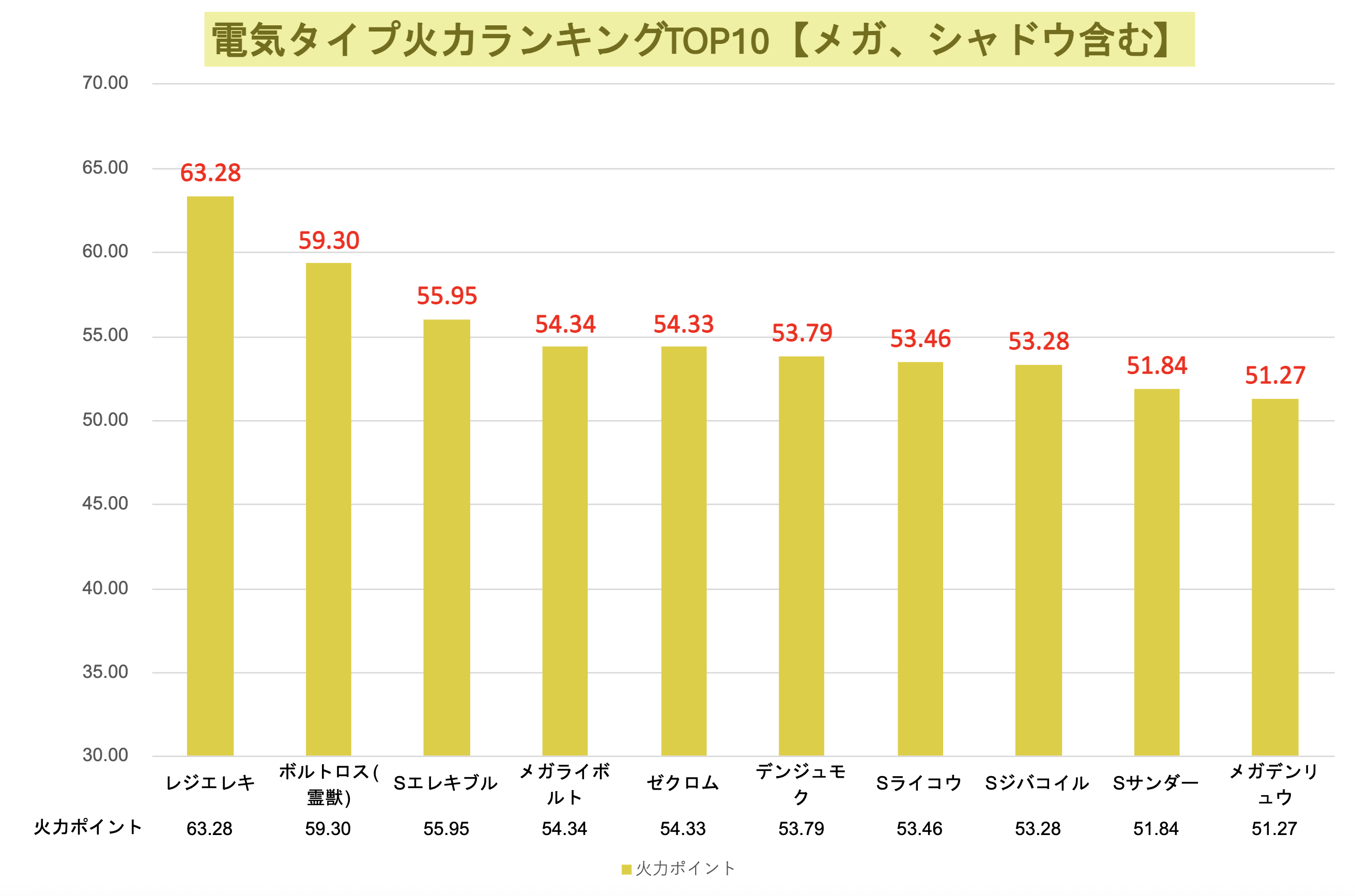 ※ノーマル&スペシャルアタック両方で電気タイプわざを持つポケモンを反映※耐久力が著しく低いポケモンは全電気タイプのランキングのみ含める※火力ポイントはDPS(ダメージ効率)のことで火力の指標